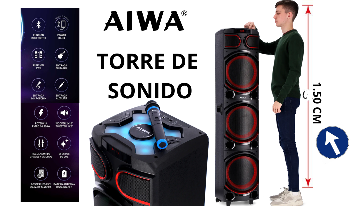 Parlante Torre de Sonido AIWA AW-T2012 Efectos de Luces, Controles DJ, 16.000W